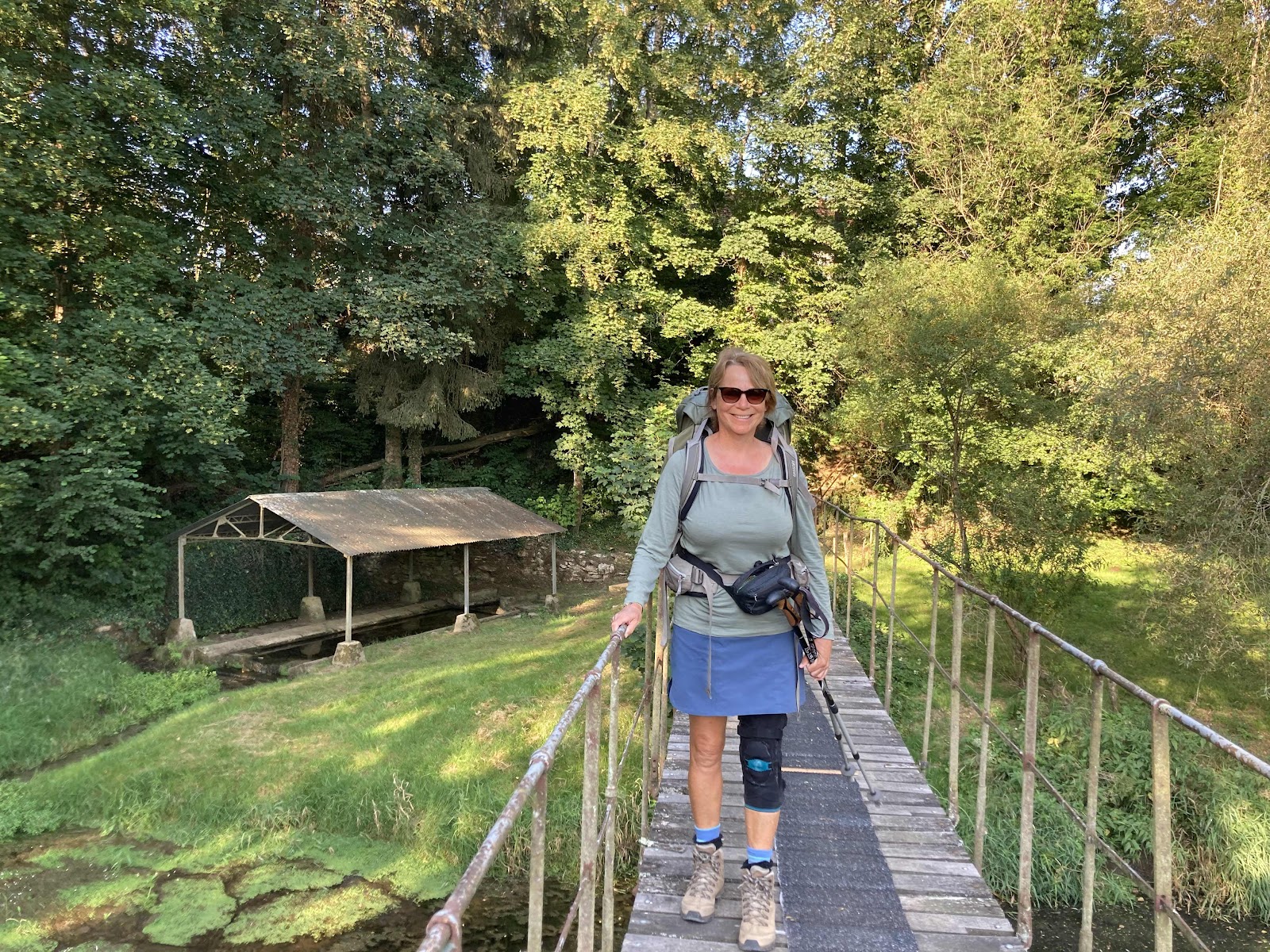 Supergezellig. Daarna gingen we verder in die modus van kapelletjes. We passeerden Monton, waar een man met zijn grasmachine bezig was. Ook daar hadden we water nodig. En hup, zijn vrouw kwam er ook bij. Een kunstenares die al in Brussel geëxposeerd had.